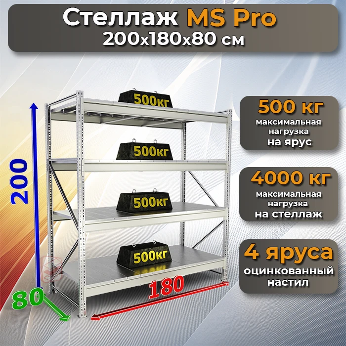 Стеллаж металлический MS Pro 200х180х80 4 оцинкованных полки - надежность и универсальность в одном решении! Стеллаж MS Pro 200х180х80 – это идеальный выбор для хранения крупных товаров и материалов.